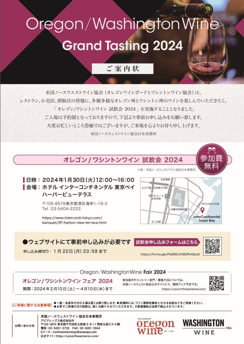 1月30日(火)東京 オレゴン・ワシントンワイン・グランド・ティスティング2024@インターコンチネンタル 東京ベイ 詳細 / お申し込みはこちら <出展ワインリスト>